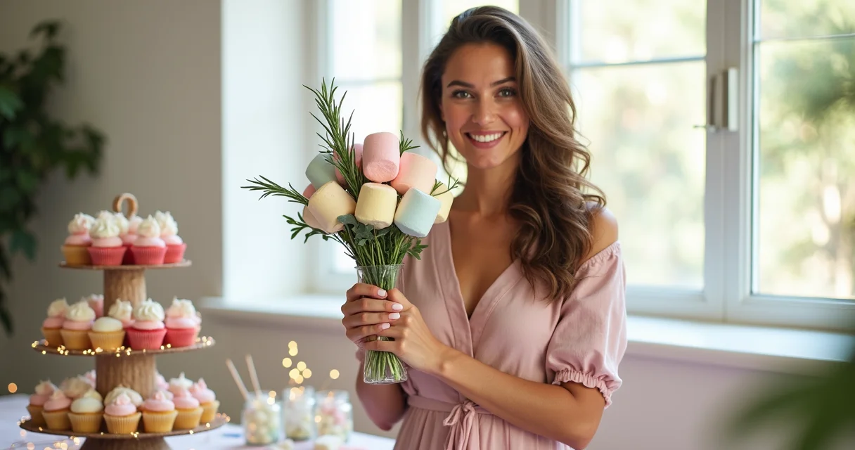 Arranjo de Flores Comestíveis: Marshmallows cortados em formato de pétalas e montados como flores, dispostos em um arranjo delicado. Perfeito para mesas de chá ou eventos mais românticos.