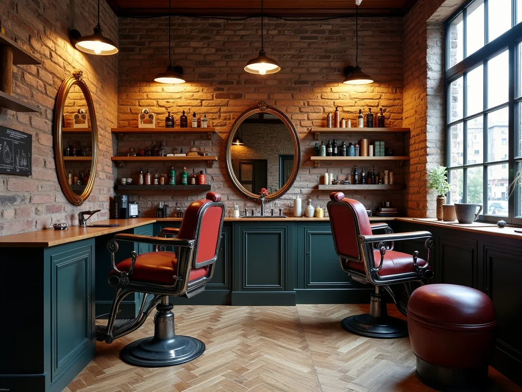 Barbearia Rústica: Aconchego e Natureza em Cada DetalheUtiliza madeira de demolição, tijolos aparentes e elementos naturais.Adicione plantas, quadros com temas campestres e móveis de madeira maciça.