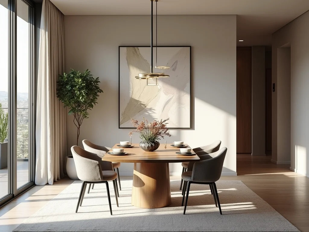 Dica Prática: Escolha uma peça de arte marcante para a parede da sala de jantar em vez de vários quadros pequenos. Isso cria um ponto focal e mantém a sensação de minimalismo.